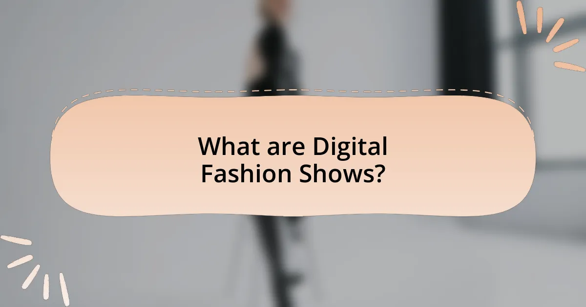 Digital fashion shows are virtual events where designers showcase their collections using digital platforms instead of traditional physical runways. These shows utilize technology such as 3D modeling, augmented reality, and live streaming to present garments, allowing for broader accessibility and engagement with global audiences. The rise of digital fashion shows has been accelerated by the COVID-19 pandemic, which prompted many brands to adapt to online formats, exemplified by events like the digital Paris Fashion Week in 2020 that attracted millions of viewers worldwide.